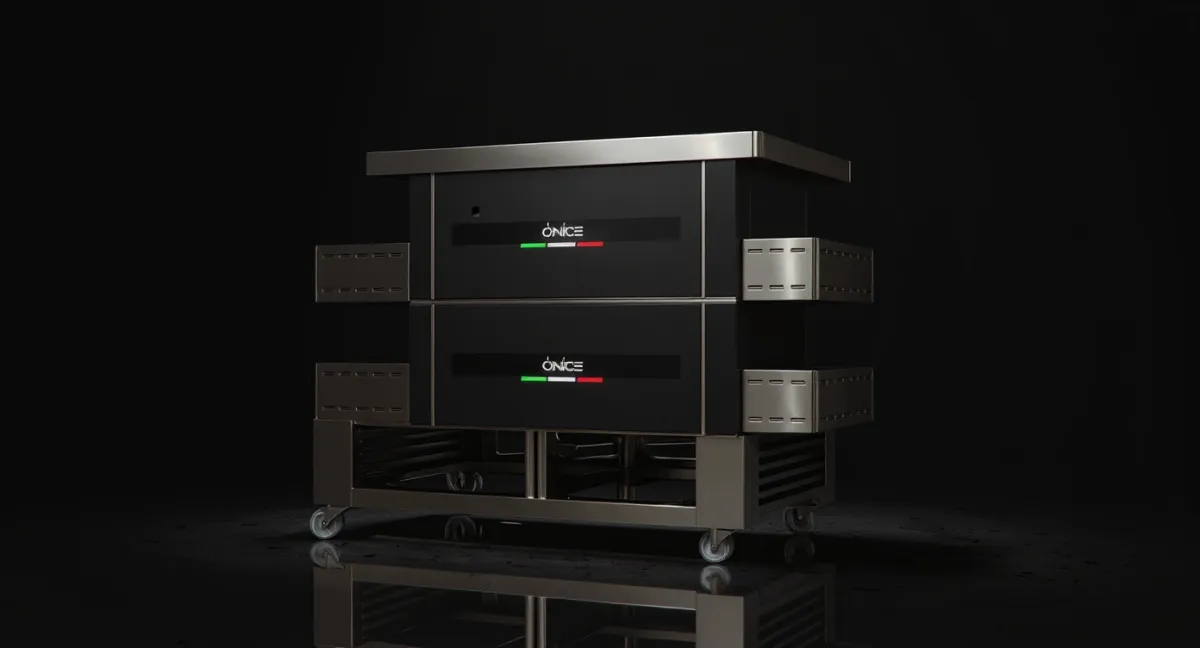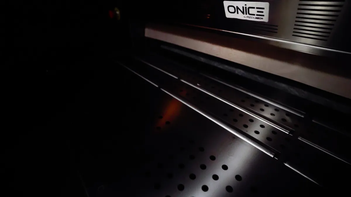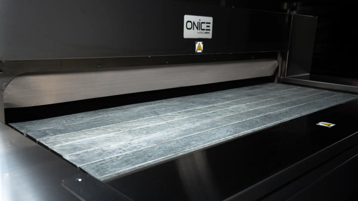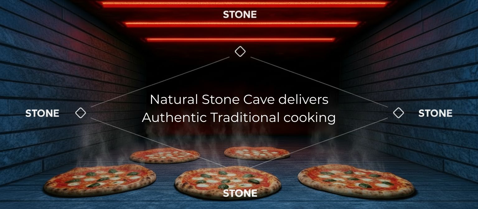 Inside Onice, heat lives in every stone. The chamber is completely surrounded by natural stone top, sides, and floor creating a radiant heat cave that delivers authentic stone-baked results with industrial precision.